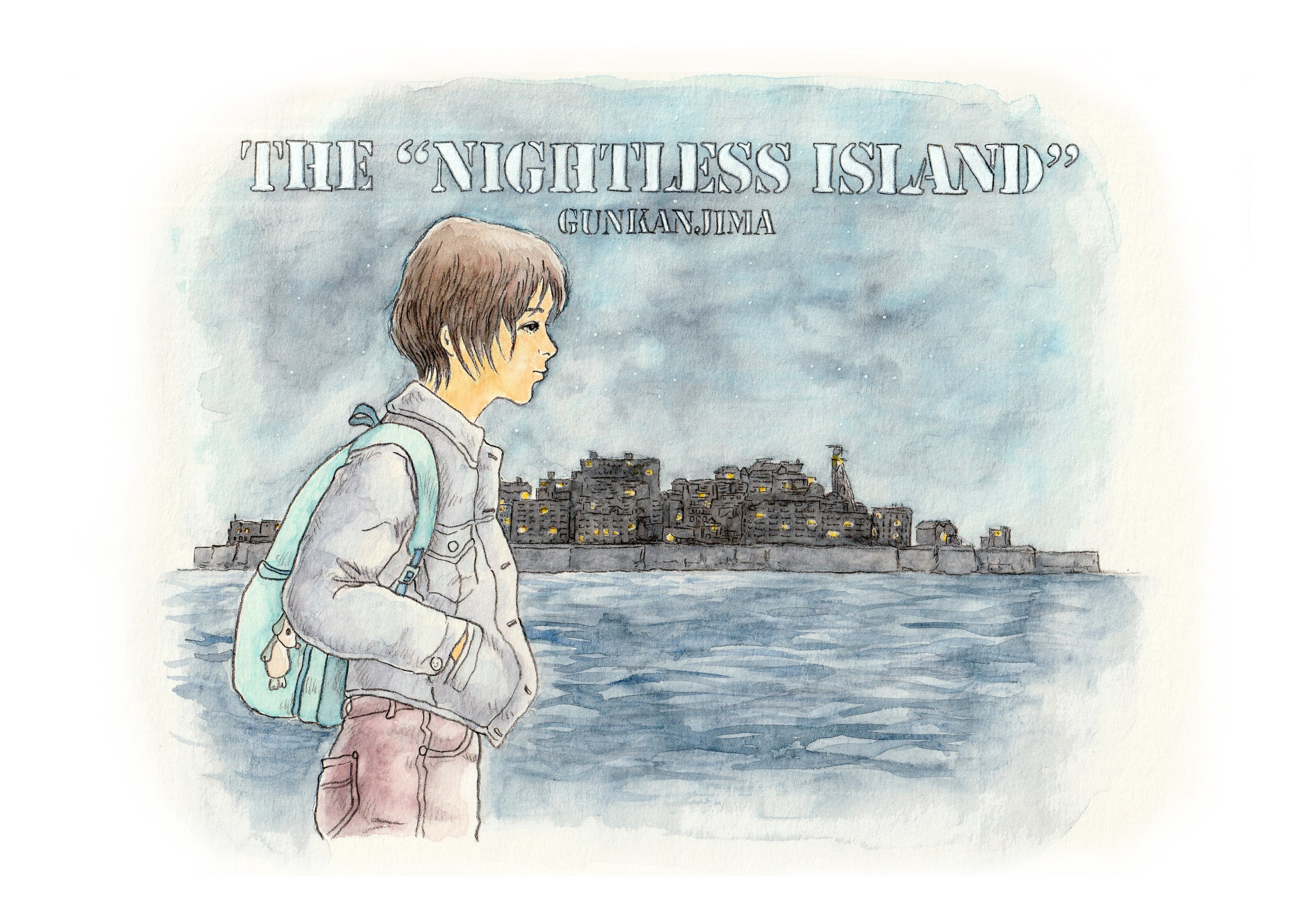 この作品は、かつて軍艦島(端島)で青春時代を過ごした、ある女性が懐かしい軍艦島の灯を望み、当時に想いを馳せているという姿です。