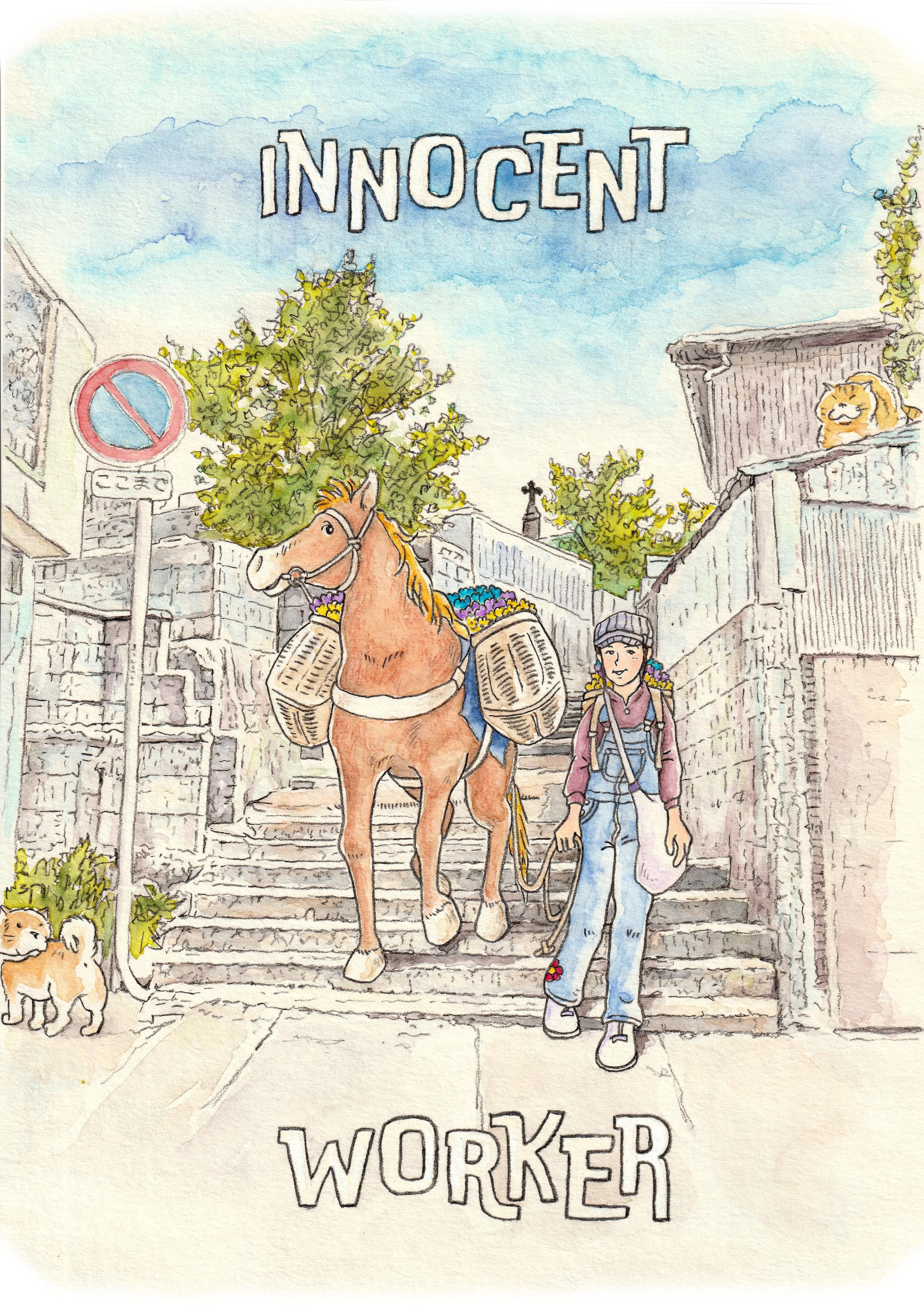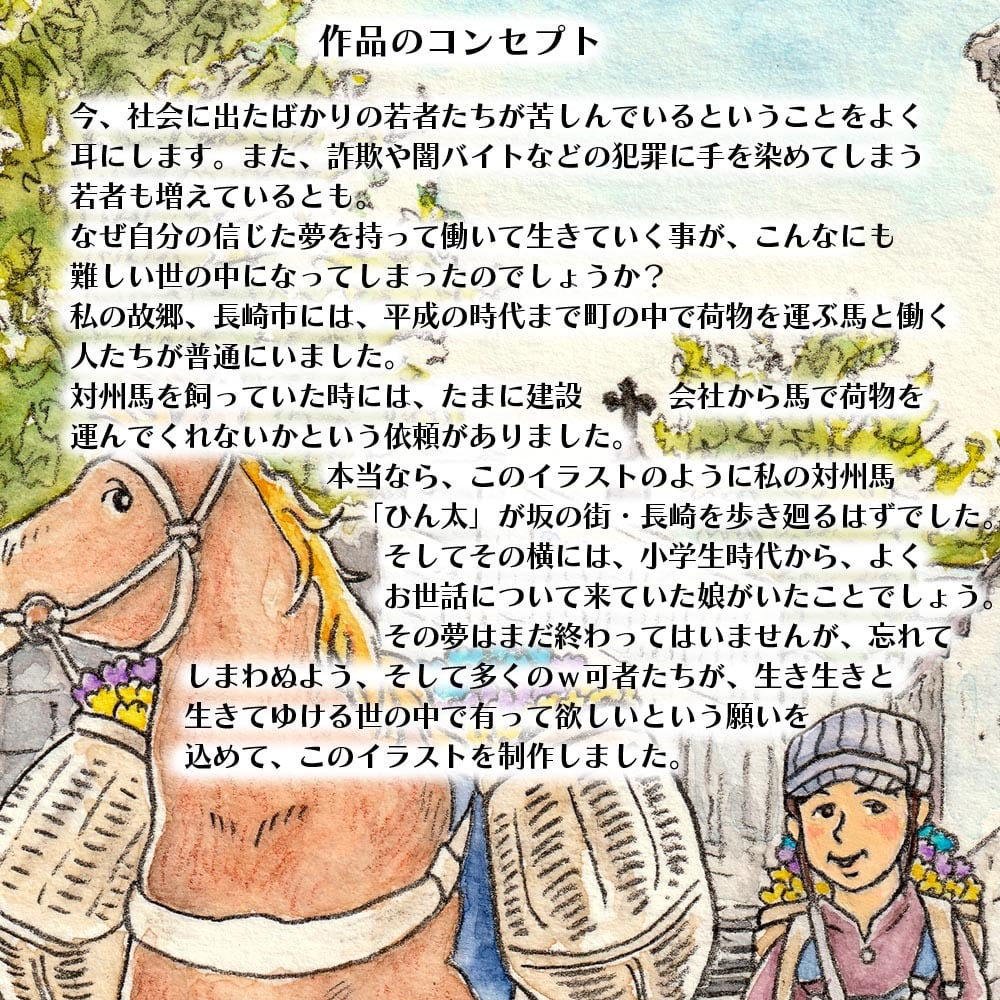 本当なら、このイラストのように私の対州馬「ひん太」が坂の街・長崎を歩き廻るはずでした。