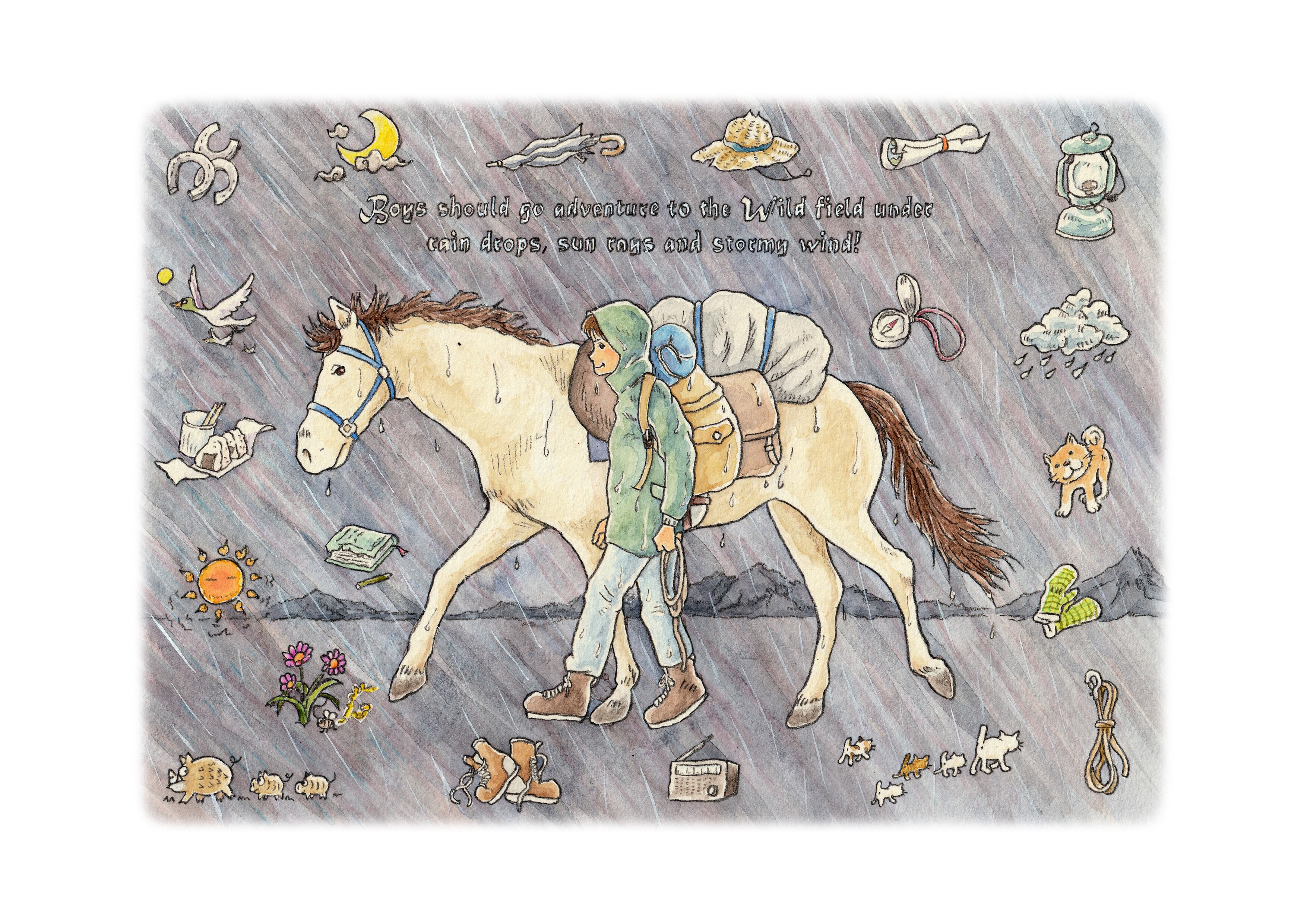 周りには様々な場面に対応するための道具類と、出会う生き物たちや草花、天候をちりばめています。