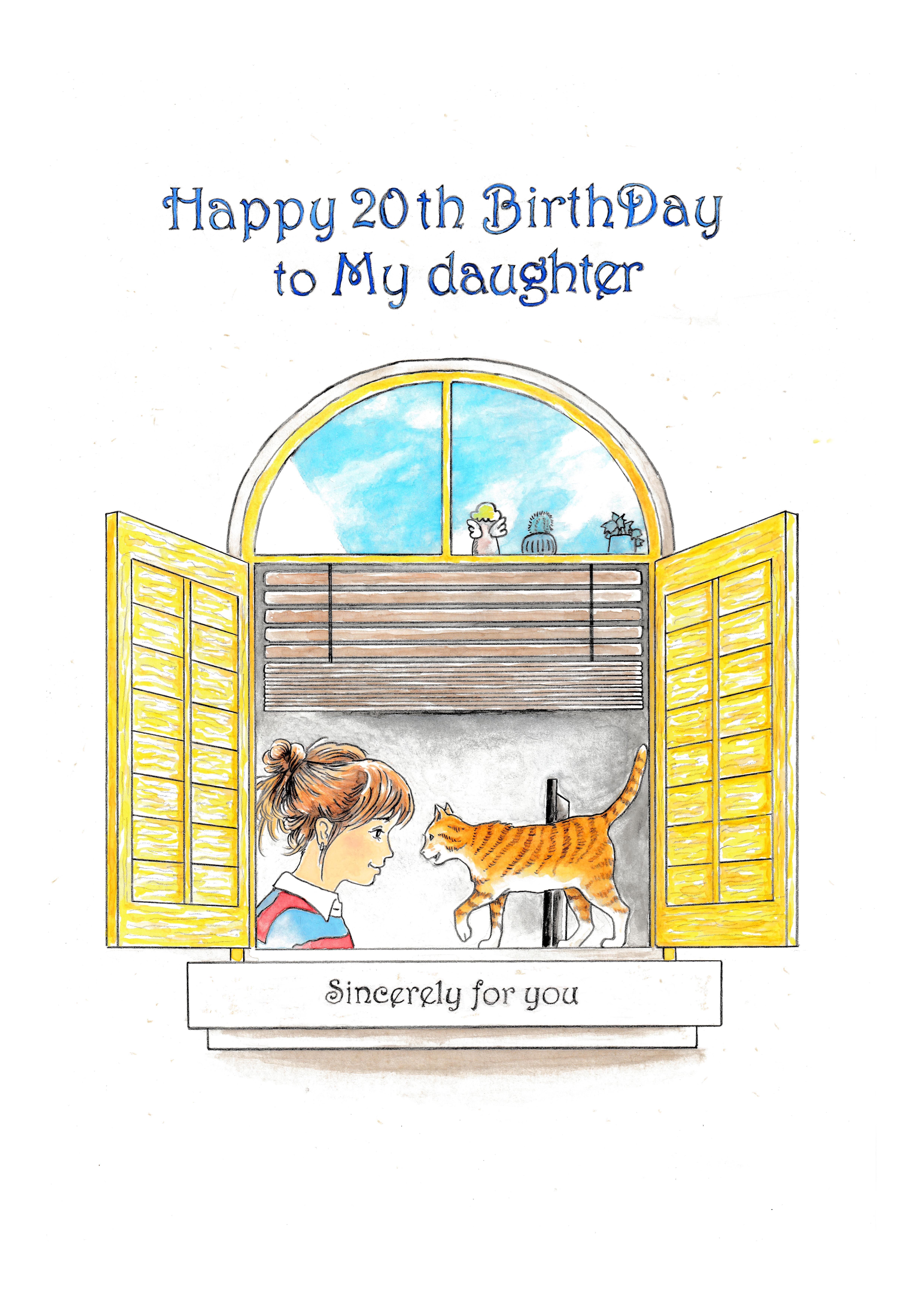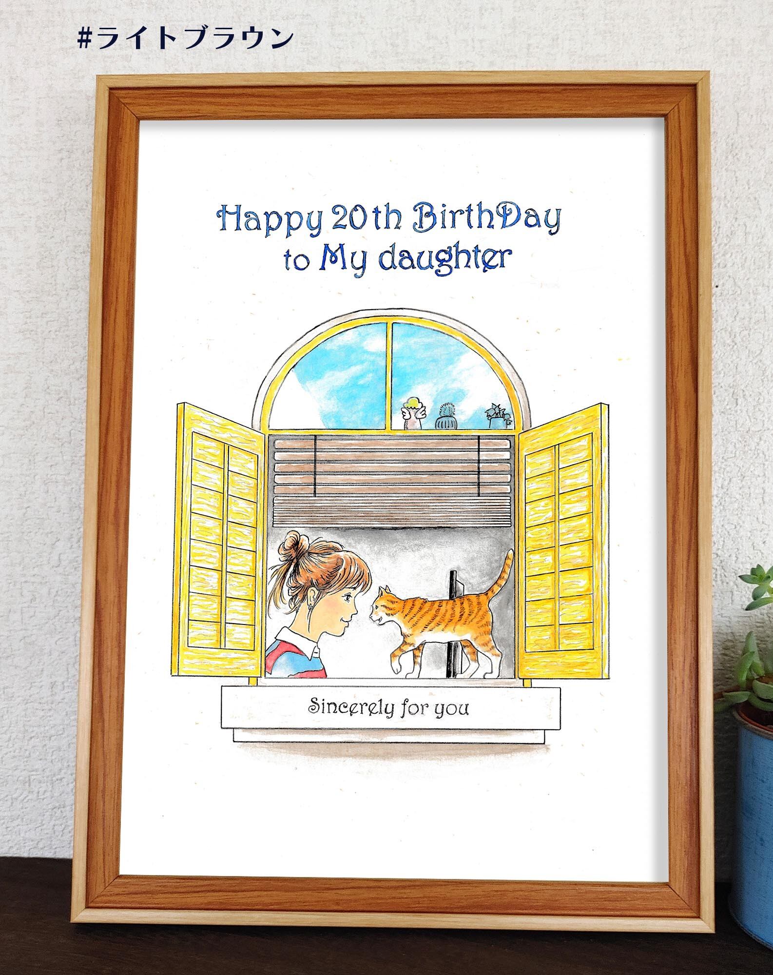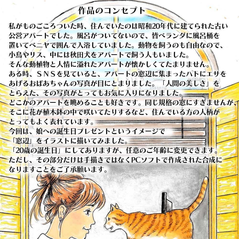 今回は、娘への誕生日プレゼントというイメージで「窓辺」をイラストに描いてみました。「20歳の誕生日」にしてありますが、「20th」を任意のご年齢に変更できます。