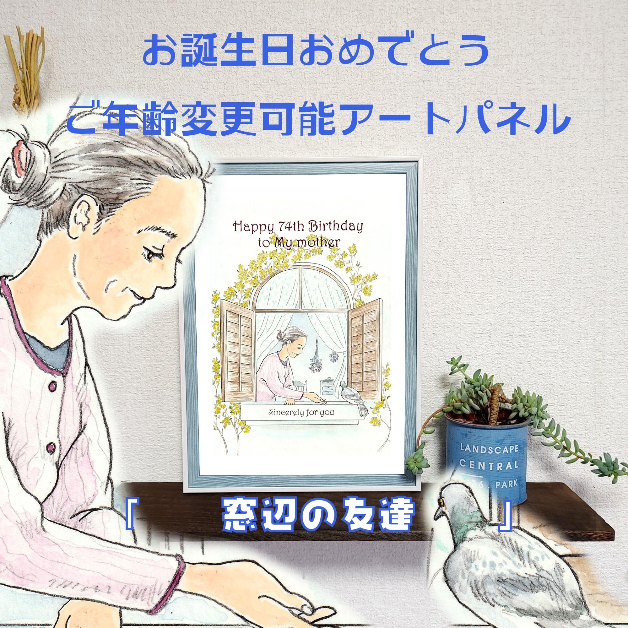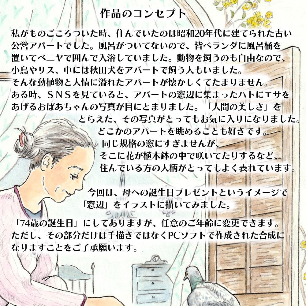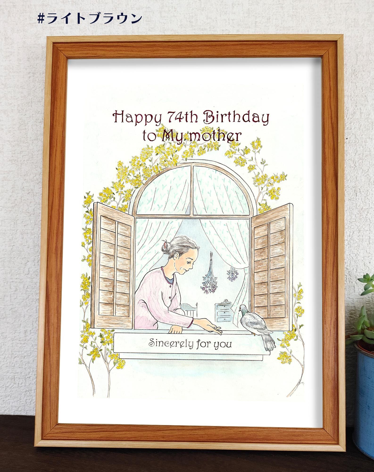 今回は、母への誕生日プレゼントというイメージで「窓辺」をイラストに描いてみました。「74歳の誕生日」にしてありますが、「74th」を任意のご年齢に変更できます。