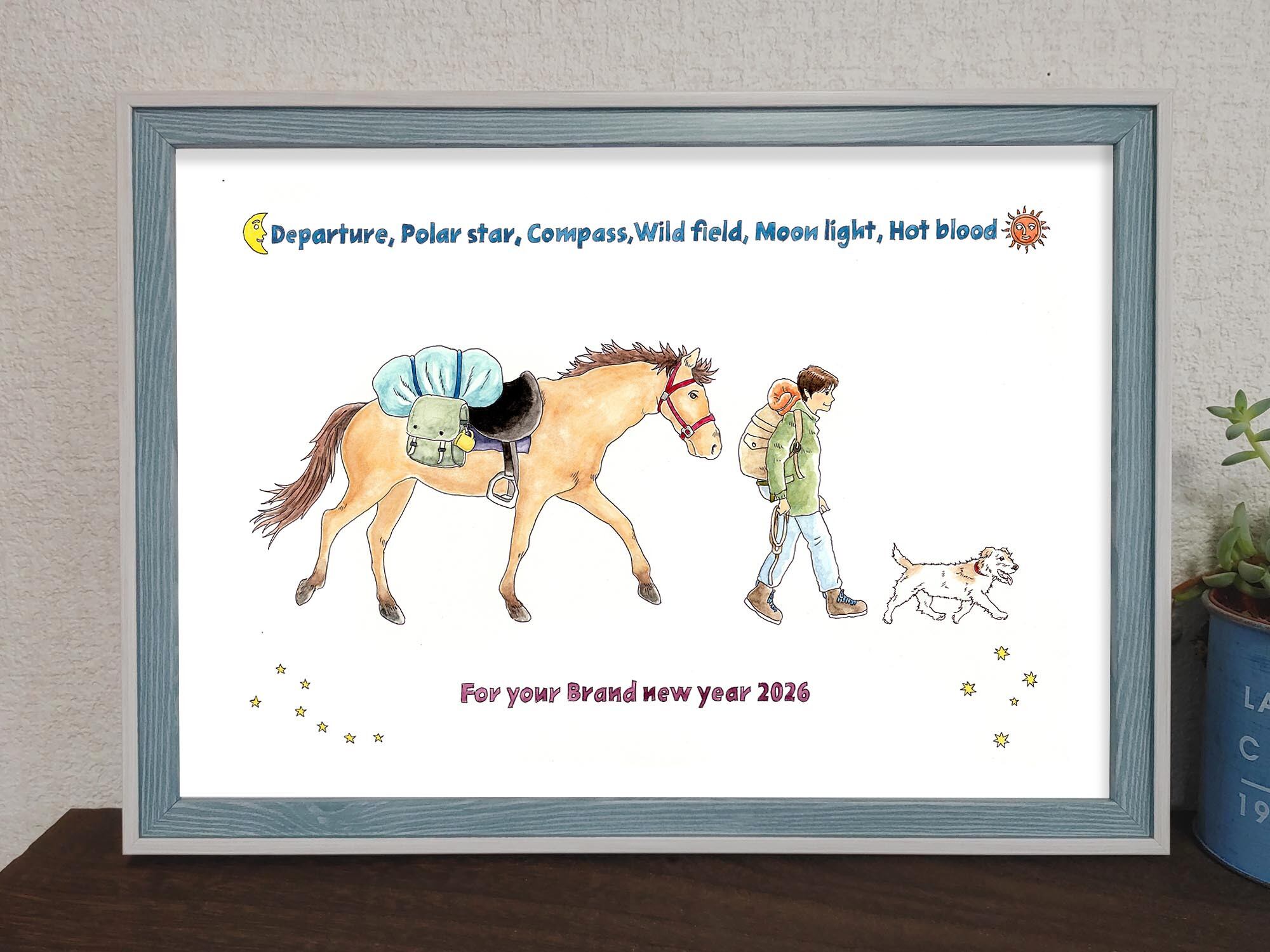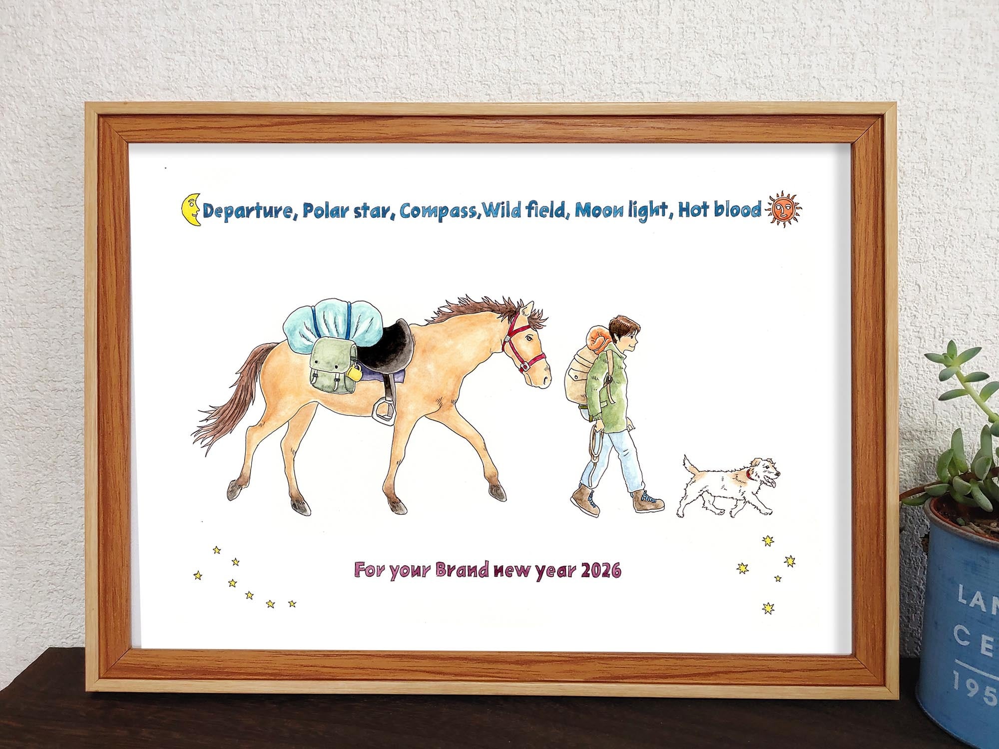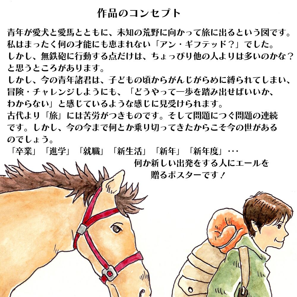 青年が愛犬と愛馬とともに、未知の荒野に向かって旅に出るという図です。
