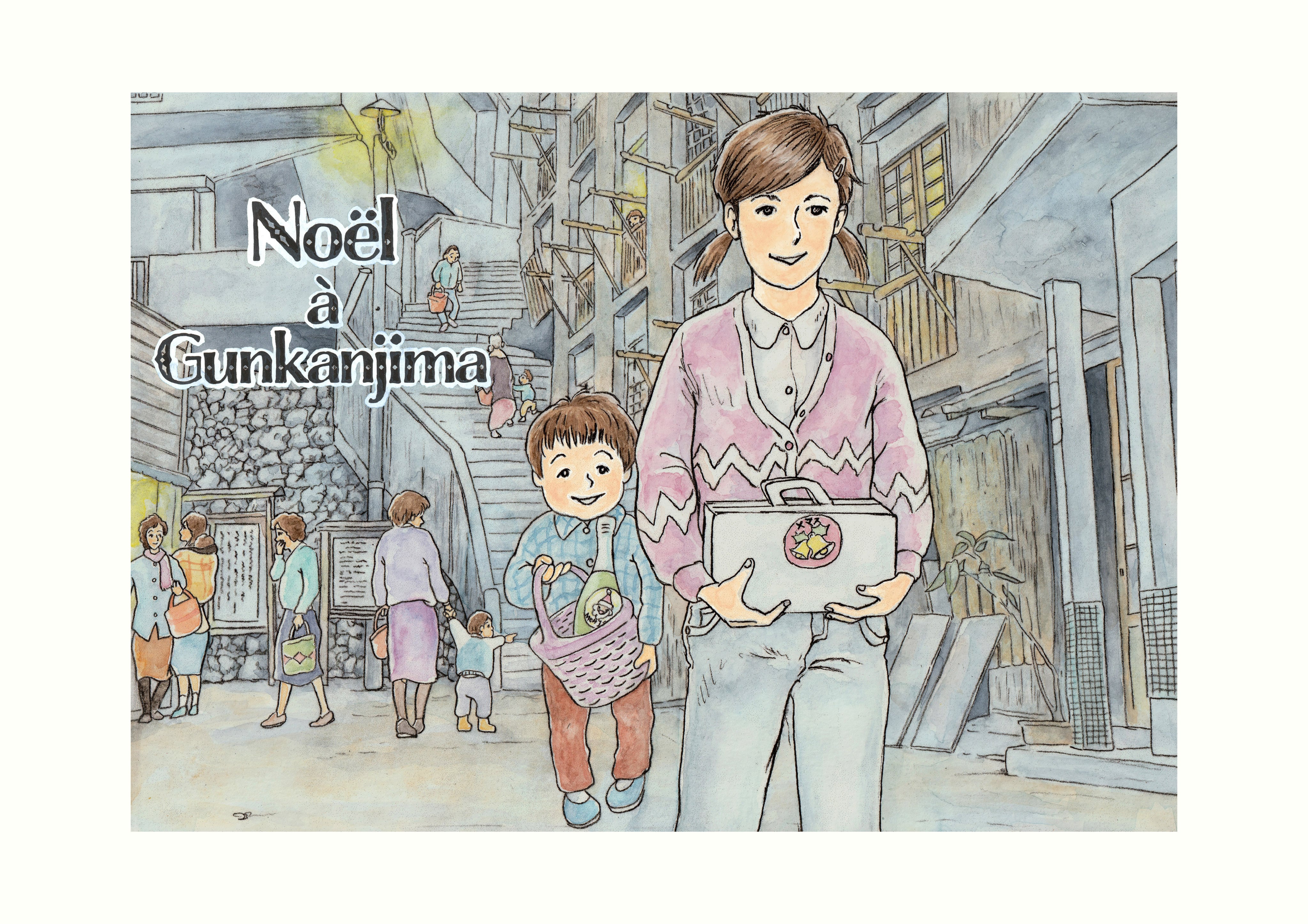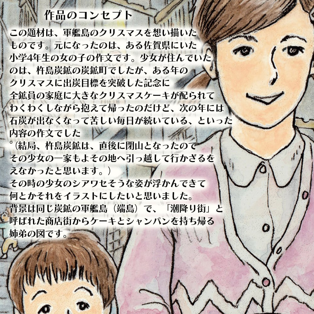 この題材は、軍艦島のクリスマスを想い描いたものです。元になったのは、ある佐賀県にいた小学4年生の女の子の作文です。少女が住んでいたのは、杵島炭鉱の炭鉱町でしたが、ある年のクリスマスに出炭目標を突破した記念に、全鉱員の家庭に大きなクリスマスケーキが配られて、わくわくしながら抱えて帰ったのだけど、次の年には