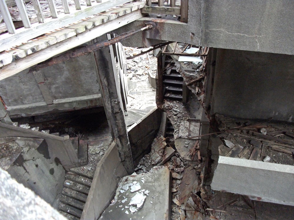 撮影場所:56号棟から撮っています。「地獄段」をのぼりきった場所で、16号棟と56号棟と57号棟が角で接近していた場所になります。画像左下から階段を下ると、56号棟横を抜けて空中痛るから65号棟に至ります。上に階段を上ると日給社宅の屋上や神社に至ります。軍艦島随一の交差点です。 撮影日:2010年3月3日 軍艦島ツアーガイドをしていた時に、東京のテレビ番組のロケ・クルーと一緒に許可を受けて上陸し、撮影したものです。 従って現在はだいぶ崩落・倒壊が進んでいるものと思われます。建物自体の倒壊の危険もある為、今後内部を撮影することは、ほぼ不可能と思います。 サイズは横長のものが 4000×3000(pix)で、縦長は3000×4000になります。 解像度は 300(dpi)です。