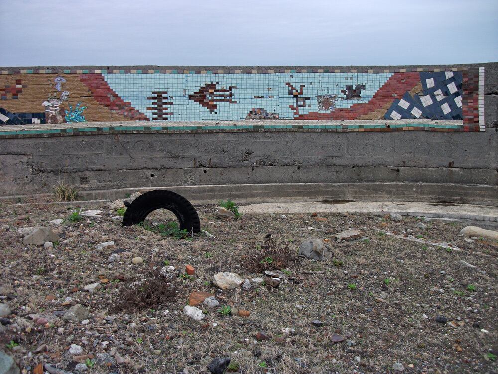 撮影場所:学校グランドの護岸に残された共同制作のタイル画。唯一、当時の色が残る部分かもしれません。 撮影日:2010年3月3日 軍艦島ツアーガイドをしていた時に、東京のテレビ番組のロケ・クルーと一緒に許可を受けて上陸し、撮影したものです。 従って現在はだいぶ崩落・倒壊が進んでいるものと思われます。建物自体の倒壊の危険もある為、今後内部を撮影することは、ほぼ不可能と思います。 サイズは横長のものが 4000×3000(pix)で、縦長は3000×4000になります。 解像度は 300(dpi)です。