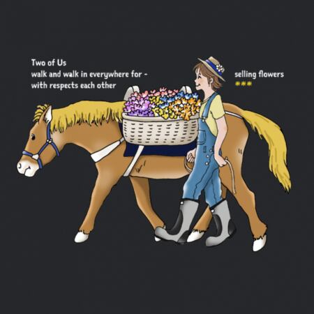 上方に、「Two of Us walk and walk in everywhere for selling flowers with respect with respects each other」 (私たち二人は、お互いに敬意を持って花を売るためにどこにでも歩いて行きます)という言葉と、中ほどに