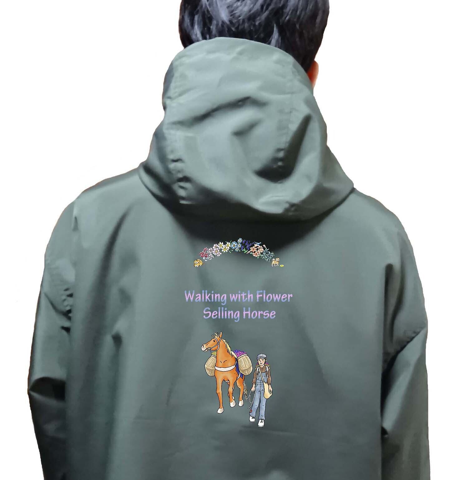 【 この商品は、ご注文を頂いた後の受注生産となります 】 「在庫0」では出品できないため、「在庫〇〇点」となっておりますが、この商品は、ご注文を頂いた後の受注生産となりますので、どうぞご理解のほど、よろしくお願いいたします。納期をご指定されたい方や、できるだけ早く商品を受け取られたい方は、どうぞ事前にご連絡くださいませ。 【 デザインについて 】 デザインは、車の入れない坂の小径を、花籠を背負って売り歩いた在来馬と少女の姿を描いたものです。 上部には、街を彩った鮮やかな花々と出会った犬やネコ。下部には、馬と少女を配置しています。 言葉は「WALKING WITH FLOWER SELLING HORSE 」は、そのまま「花を売る馬と歩く」です。 「どんなに時代が変わっても、誠実に生き、働く者を馬は信頼し、よきパートナーとして働く。馬のように誠実に生き、そして働き、生きていこう」という想いを込めたデザインです。 また、「人と馬がお互いにリスペクトしながら、自らの人生を切り拓くために挑戦していく」という応援を込めたデザインでもあります。 【 ハンドクラフトについて 】 これまでメーカーに外注していると、お客様にとっては、かなり高額になってしまうと感じました。 クオリティはそのままで、何とかコスパを上げられないかと思案し、プロ仕様の転写シートだけをメーカーで作成して、ハンドメイドで制作したところ、外注と全く遜色ないクオリティの商品ができる上に、価格を外注より1,000円~1,500円くらい下げることができることがわかりました。 またハンドメイドとした方が、プリント位置を変えたり、プリント数を増やしたり、オブジェクトの大きさを変えたりなど、細やかなニーズにお応えすることも可能であることがわかりました。 欠点は、専用シートはメーカーしか製造するノウハウがありませんので、シートの在庫が無い場合、お時間を頂くことになります。 【 返品返金/交換について 】 制作には神経を使っておりますが、どうしても不良品をお届けしてしまう可能性もございます。商品到着後、欠陥品、不良品、あきらかに見本と違うと判断された場合には、即刻、返品返金あるいは、交換に応じさせていただきます。 その場合は、商品到着後から一か月以内にご連絡をお願いいたします。また、できましたら不良個所を撮影した画像をご添付いただき、どのような不都合であるのかを教えて頂けましたら、大変有難いです。今後の改善に役立てたいと思います。 【 サイズ(男女兼用) 】 M L XL 2XL ※サイズについて販売サイトからのレビュー ◎とても着やすくて、意外に暖かかさもありとても満足しております。 身長176でXLを購入しましたが、着丈もいい感じです。 幅広にも余裕があるので中は着込んでも大丈夫です。 ◎身長165cm、体重55㎏の息子にLサイズ購入。 少し大きいかと思ったが、身丈、袖丈が丁度いい長さなので、大きすぎる感じはしない。 ◎155cm、コロコロ女子。ダメもとで買ってみたのですが、これが良いんです。 メンズLサイズでバッチリです。少し大きめくらいがおすすめです。 縫製がしっかりしています。内ポケットもあります。なによりリーズナブル!買って正解でした!欲を言えばフードがもう少し大きいと良いと思いました。 サイズにつきましては、サイズ・モデルの画像、「お客様の声」をご参考にされてください。サイズや商品について不安な点などありましたら、どうぞお尋ねください。 【 カラー 】 ダークグリーン、ブラック、チャコール、ネイビー、オイスターベージュ (5色) 【 ギフトラッピング 】 送付方法(クリックポスト)に規格制限があるため、PP袋にシールという、非常に簡素なラッピングのみ、無料にてご対応いたします。 【 素材 】 ポリエステル 100% 【 メーカー 】 W wonyo #馬デザイン #馬グッズ #馬パーカー #馬ジャケット